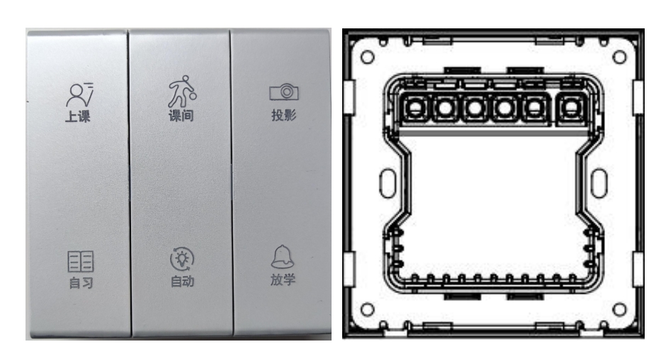 本产品是一款晶讯智能教室六位场景开关,它是一种基于蓝牙 mesh 无线通信的场景控制开关,内置智能无线蓝牙模块,蓝牙模块完全依从Bluetooth 5.0版本规范和Bluetooth Mesh 1.0.0 & 1.0.1,可以让蓝牙智能设备便捷地接入晶讯云服务,本产品与网关通过蓝牙 mesh 无线通信,用户可以在手机 APP 端和晶讯云服务控制场景变换,也可以通过本地按键变换场景,并且受控设备通过无线网络同步设备状态到手机 APP 端和晶讯云服务。